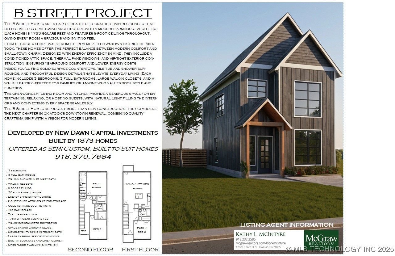 Your Downtown Dream Home Awaits on the corner of 4th & B Street. Experience the perfect balance of craftsman character and modern farmhouse style in this beautifully designed two-story home just steps away from Skiatook's revitalized downtown district. Step inside through the covered front porch and be greeted by a 19-foot-tall entry ceiling and a custom built-in bookcase that sets the tone for the home's thoughtful craftsmanship. The open living room and kitchen offer a wide, inviting layout ideal for entertaining or relaxing with family. With 9-foot ceilings throughout, this home feels spacious and airy in every room. It features 3 generous sized bedrooms, 3 full bathrooms, and 1763 square feet of living space-complete with solid surface countertops, tile tub and shower surrounds, large walk-in closets, and a walk-in pantry. Enjoy year-round comfort and efficiency with energy efficient windows, an air-tight exterior envelope, and a conditioned attic space that provides ample climate-controlled storage. A covered back patio extends your living area outdoors, perfect for morning coffee or evening gatherings. To suit a range of budgets and preferences, this home is offered in three distinct finish levels, allowing buyers to personalize their space while maintaining the quality and craftsmanship 1873 Homes is known for. Offered as a built-to-suit semi-custom home by 1873 Homes, this thoughtfully designed home offers warmth, comfort, and character-all within walking distance of the heart of Skiatook.