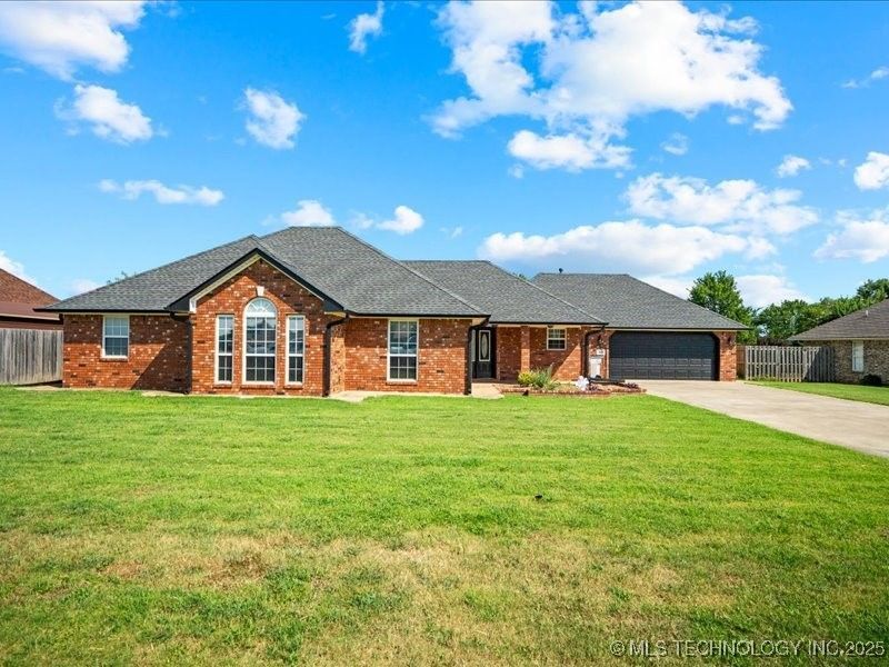 STOUT ADDITION!!!! Beautiful, custom-built 3BD/2BA home in the prestigious Stout Addition of Checotah. Spacious open floor plan with living, family, dining, and kitchen areas filled with natural light and new quality white blinds. Kitchen features granite countertops, travertine backsplash, movable island, and gas or electric range option. Living room is designed to accommodate a gas fireplace-ready for installation. Primary suite offers double vanities, soaking tub, and large closets. Interior upgrades include spray foam insulation, new toilets, beautiful white blinds, and best of all a SAFE room! French doors lead to a fully fenced backyard with east-facing patio-wired for a hot tub-plus a raised garden area. Oversized 2-car garage with cabinets and storage. Pristine and move-in ready!