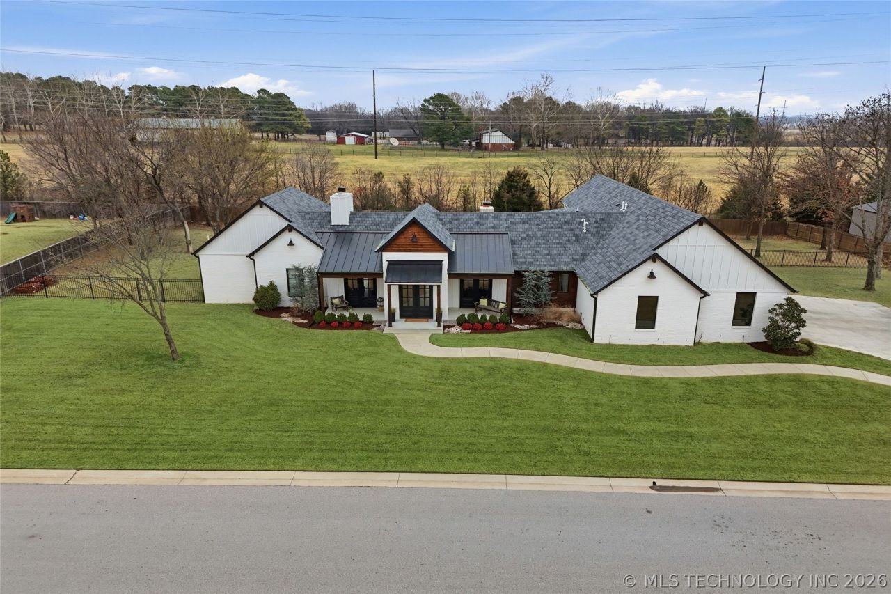 Welcome to this custom single-story ranch with a private pool & spa in the gated Frazier Lakes Estates, located in highly sought-after Bixby West Schools. Situated on a beautifully maintained 0.77-acre fenced lot, this home offers privacy, function, and thoughtful design throughout. Featuring 3 bedrooms (each with a private ensuite), an office/game room that could serve as a 4th bedroom, and a secluded primary wing with a spa-inspired bathroom complete with an standalone tub, oversized zero-entry shower, bench seating, rainfall head and handheld wand. The open-concept living area showcases real wood floors and a wood-burning fireplace, flowing seamlessly into the chef's kitchen with a large walk-in pantry, coffee bar and ice machine. Step outside to a backyard retreat with a covered patio fireplace, heated saltwater pool with sundeck and hot tub, and direct half bath access for easy pool days. Additional highlights include a 3-car side-entry garage with EV outlet, tankless water heater, fiber internet, irrigation front and back, and a fully stocked neighborhood lake. Refined, resort style living - inside and out.