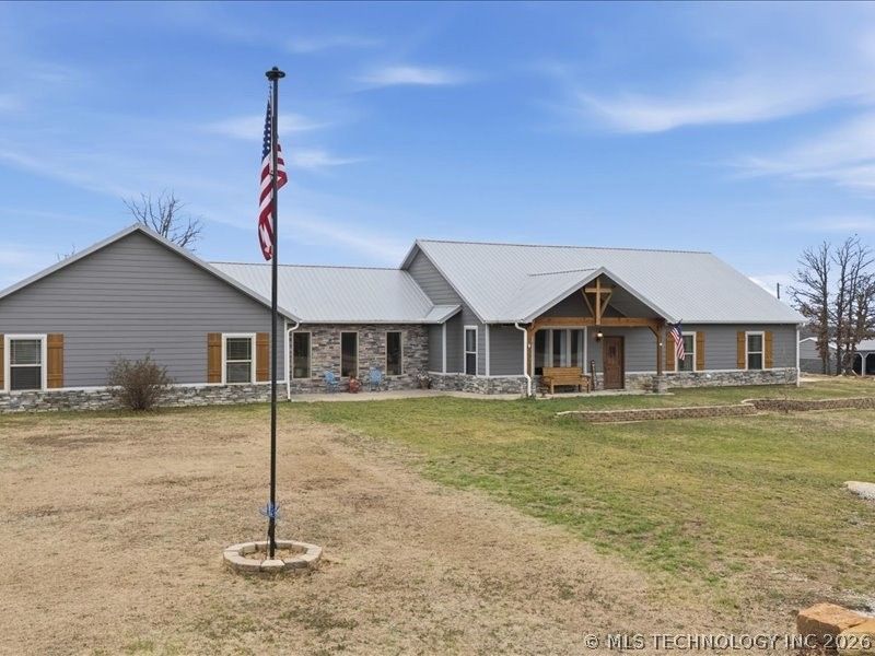 Incredible one-owner custom home nestled on 10 beautiful acres just minutes from Skiatook Lake, Crosstimbers Marina and Osage Park boat ramp, swimming beach, for endless fun. This is where country quiet meets everyday convenience.Designed for versatility and comfortable country living, this 5-bed, 4-bath offers an open-concept layout with soaring vaulted ceilings, a cozy gas fireplace, natural light, and gorgeous wood cabinets with granite countertops throughout. A spacious mudroom provides the perfect drop zone for boots and bags, offering extra storage for everyday functionality while keeping neat and organized.The kitchen flows seamlessly the perfect setting for hosting. New luxury vinyl plank flooring brings durability and refined style. The primary suite features an oversized walk-in shower with double shower heads, a generous walk-in closet, and direct access to its own secluded patio ideal for slow mornings with coffee in hand. A thoughtful split floor plan includes 2 bedrooms of which one is oversized currently used for a game room. Separate full kitchen offers flexibility, whether for entertaining, or the ultimate chef's prep space.Unwind in the inviting sunroom, complete with a glass garage door that opens to fresh air for year-round enjoyment and social gatherings. Outdoors, you'll find a fully stocked pond with floating dock, a custom concrete walkway leading to gazebo, and abundant wildlife.The impressive 30x95 insulated 4-bay metal shop is equipped w/electric, heat, two auto overhead doors, a full bathroom, its own separate aerobic system ideal for a home-based business, hobbies, or storage.A rare opportunity to own country luxury in a prime location near Skiatook Lake. Schedule your private tour and come experience the space, freedom, and lifestyle this property offers.