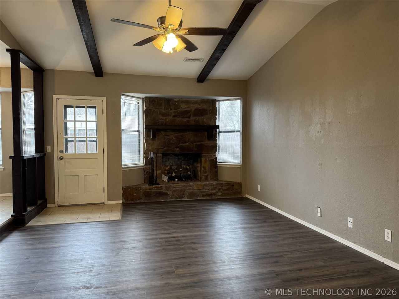 Conveniently located just minutes from HWY 75 and the Creek Turnpike! This 3 bedroom, 1.5 half bath sits on a spacious cul-de-sac lot. Living room features include vinyl wood flooring, wood beams, floor to ceiling stone fireplace and built in storage.