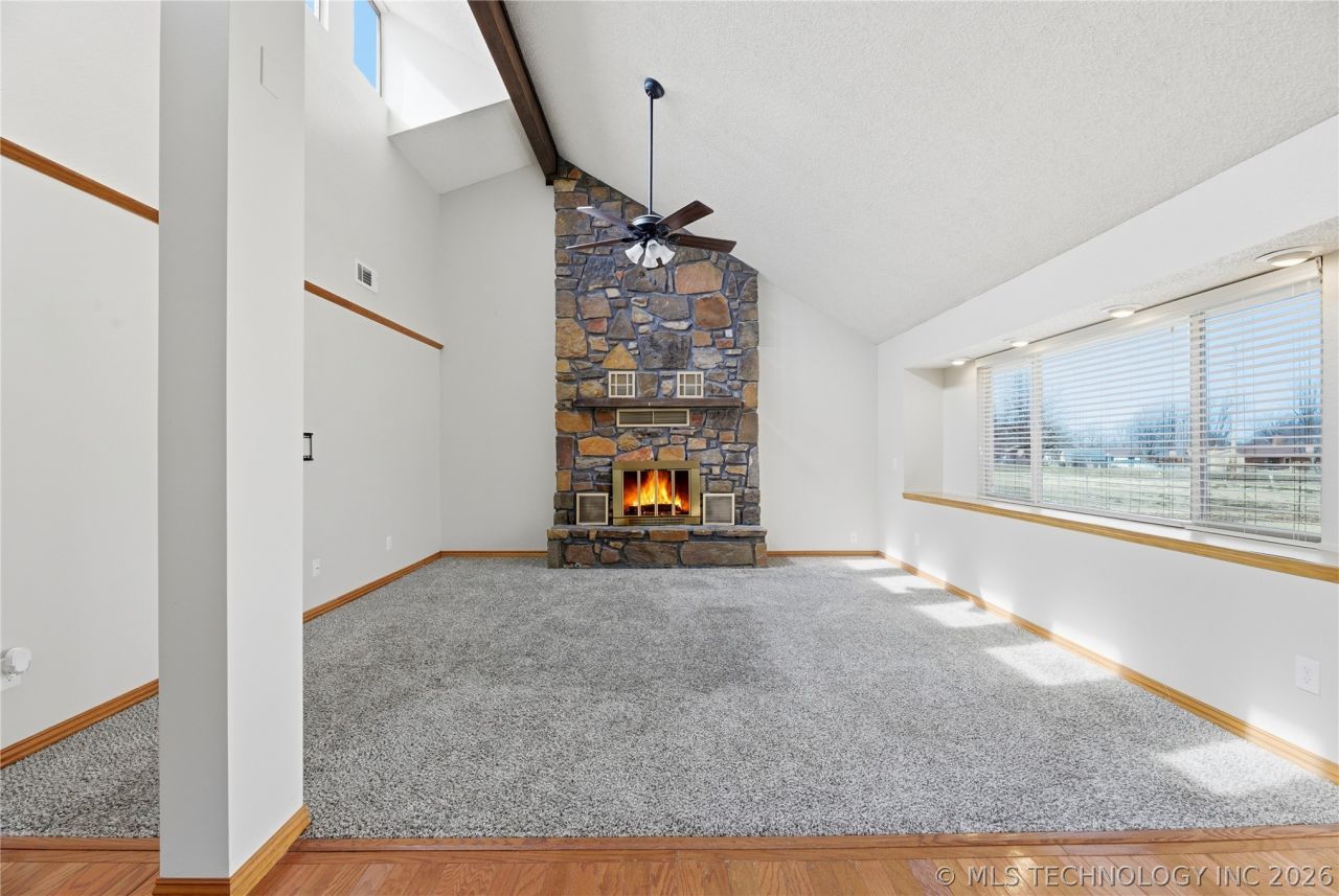 Beautiful home situated on a full one acre lot, a rare opportunity offering space, privacy, and room to enjoy the outdoors. Mature trees and established landscaping create a peaceful setting that is hard to find in Owasso city limits. Inside, the spacious living room features vaulted ceilings, abundant natural light, and a cozy fireplace as a focal point. In addition to the main living area, there is a separate bonus family room or den with extensive windows, providing flexible space for entertaining, a media room, home office, or play area.