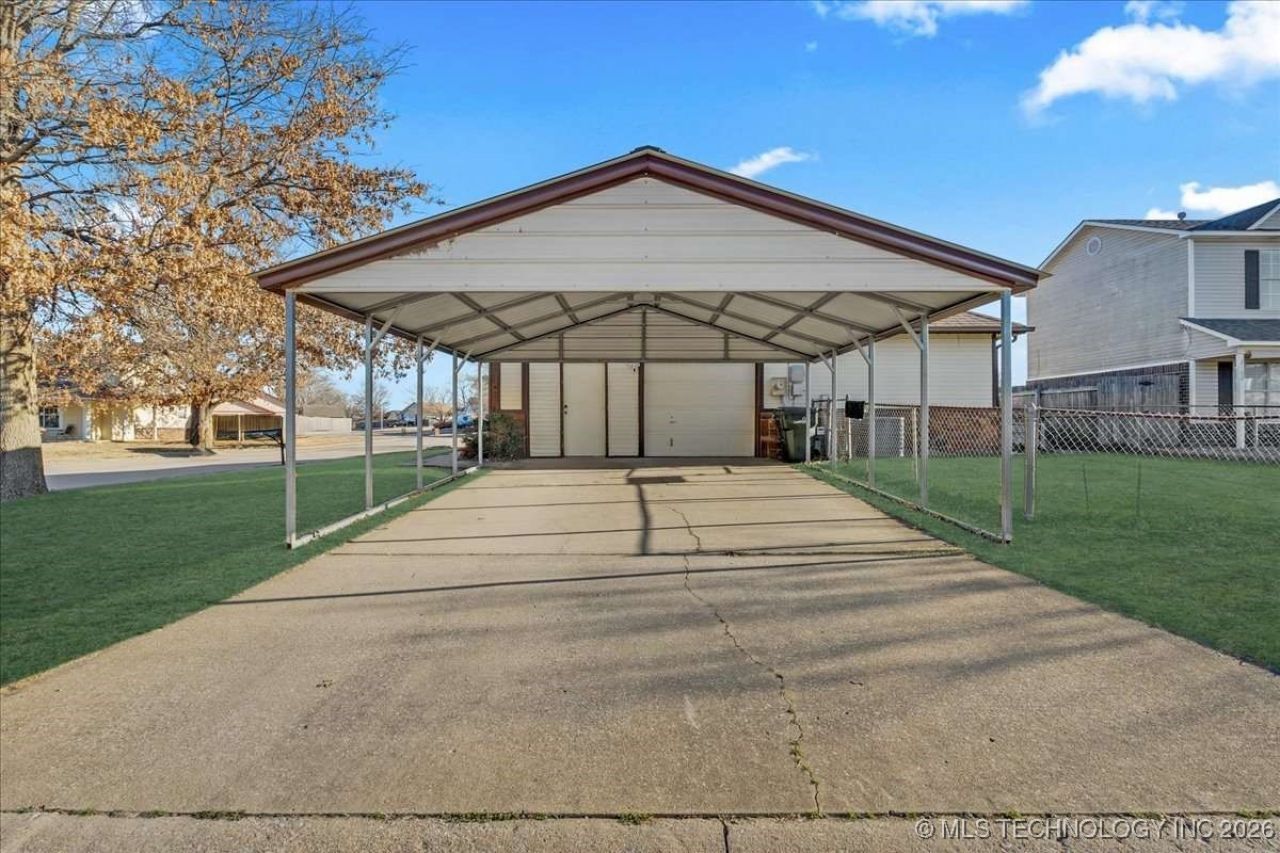 Well-maintained 3 bedroom, 2 bathroom single-level home in the established South Pointe subdivision of Claremore, offering plenty of functional living space. The home features a stone exterior with a covered front porch, a roof replaced within the past 6 months, vaulted ceilings in both the main living area and primary suite, wood-style flooring, and a stone fireplace. The kitchen offers ample cabinet and counter space with an open connection to the dining area. Bedrooms are comfortably sized with neutral finishes, and the primary suite includes a vaulted ceiling and private en suite bathroom with a jetted whirlpool tub. The fenced backyard includes a raised deck, and a covered carport with extended driveway provides convenient off-street parking and storage. Located within Claremore Public Schools and near shopping, dining, and commuter routes.