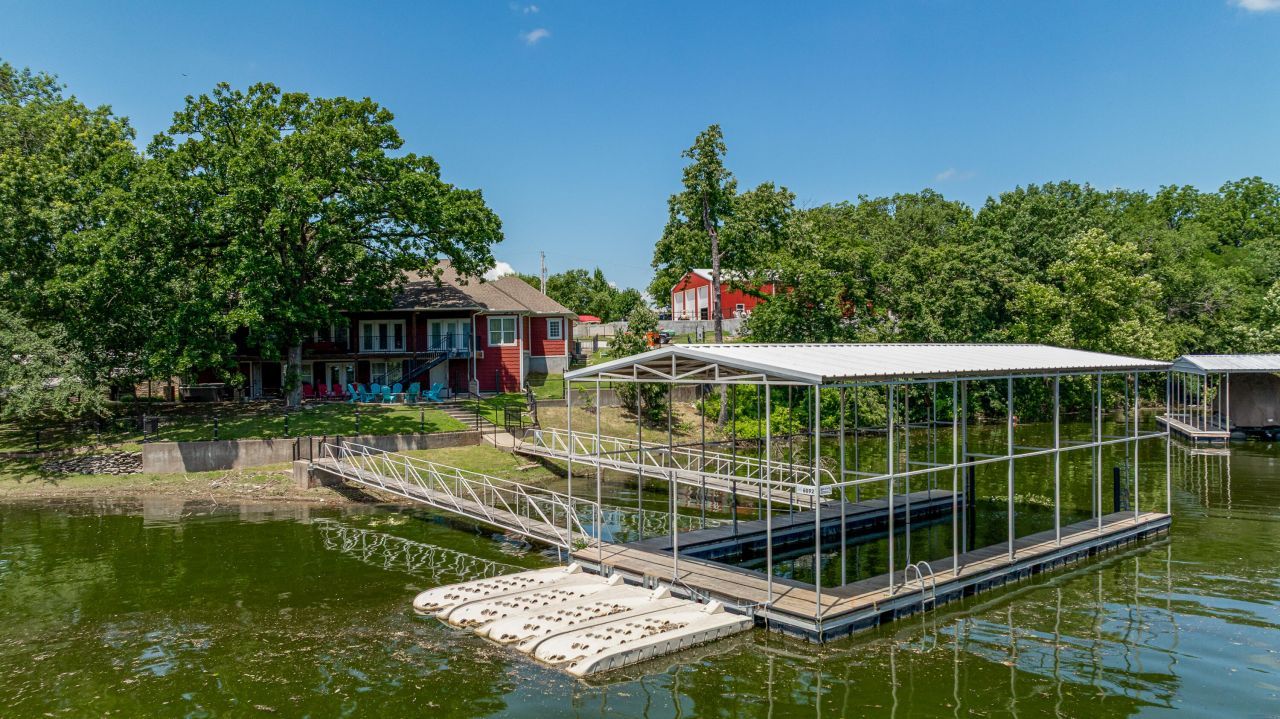 Discover an extraordinary lakefront property designed to host unforgettable gatherings, retreats and reunions. Nestled on 1.53 acres on South Grand Lake, this property is completely turnkey offering a total of 6,700 SF with 8/9 beds and 7.5 baths. Main home offers 4 bed/3 bth, 2 living areas, 2 kitchens, 3 car garage, storm shelter + gentle slope to boat dock in deep water. The Barndominium is a 50' x 75' building offering 4/5 additional bedrooms, 2 kitchens, large gameroom and in ground pool! This one of a kind lakefront property truly has it all! Located in a protected nook off of Scotty's Cove, close to both land and lake amenities! Just 55 minutes from Tulsa. Short term rental friendly.