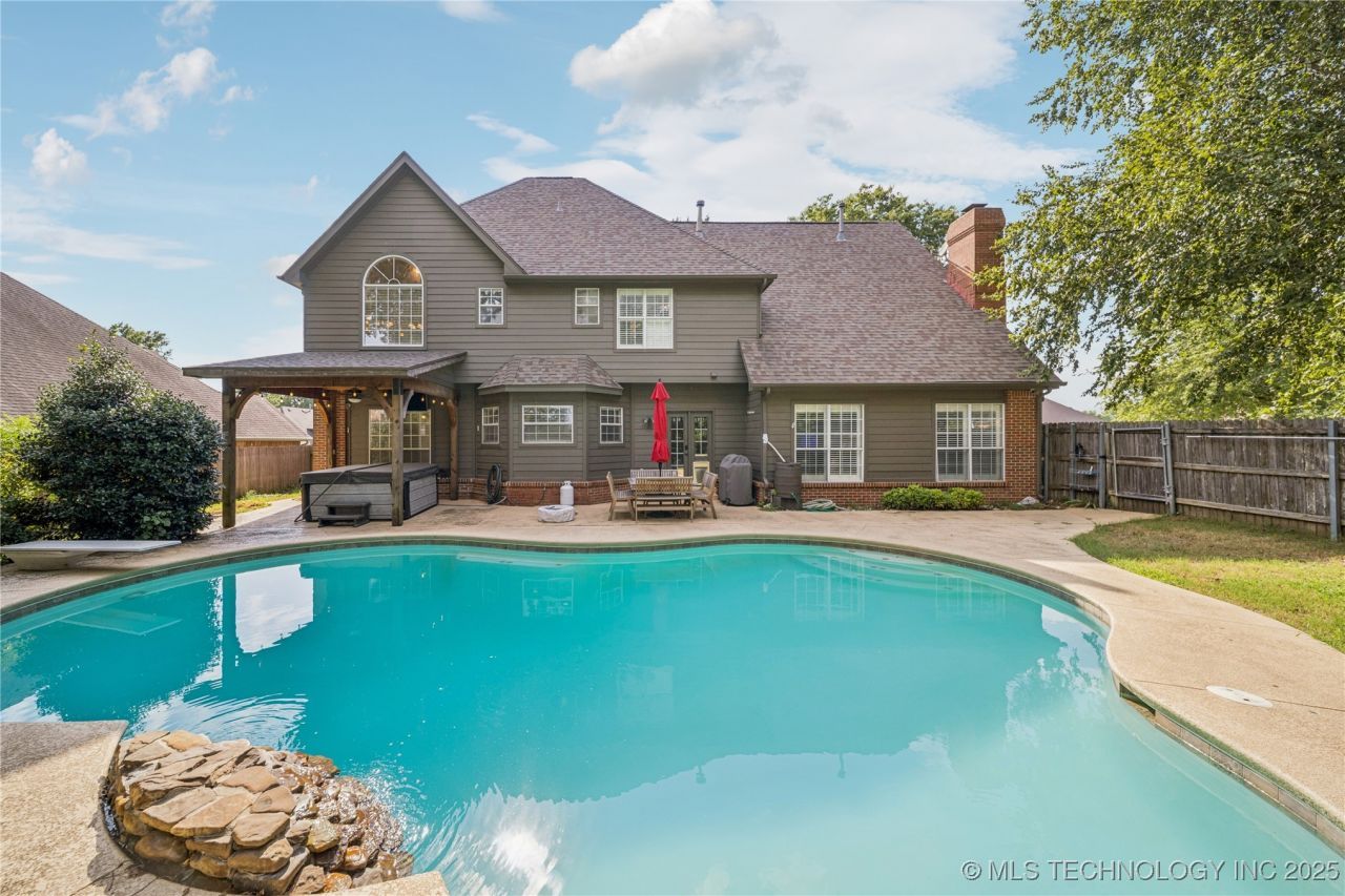 Immaculately kept full brick home with inground pool on over 1/3 acre corner lot in Windsor Lake. Central location near everything including shopping, dining, Owasso elementary and high schools, and only blocks from the highway. Wonderful floorplan has multi-use rooms for a functional home with flexibility. Impressive 2-story entry, formal living and dining, private office with hardwoods. Open granite kitchen with island, newer appliances and large breakfast nook. Great room with woodburning fireplace is open to breakfast nook. Dual staircases lead to 2nd floor with with vaulted primary suite, 3 additional bedrooms, laundry room, and 3 full baths. One bedroom has hardwood floors and private bath. Full privacy fence and beautiful mature trees surround the inground, gunite diving pool with rock waterfall feature. Plenty of space for outdoor entertaining with large covered back patio. Lots of extra upgrades add even more value: SOLAR powered, generator ready, new hot water tank, plantation shutters, vaulted ceilings, sprinkler system, beautiful landscaping with lighting. Oversized side-entry garage with epoxy floors, high-end storage cabinets/shelving, extra storage and storm shelter. Great location in beautiful neighborhood with Windsor Lake and trails across the street.
